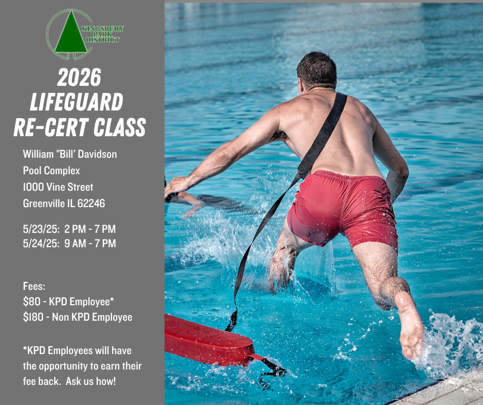 The Kingsbury Park District is offering an American Red Cross Lifeguarding/First Aid/CPR/AED certification course. This is a great opportunity to become a certified lifeguard before the summer pool season begins!