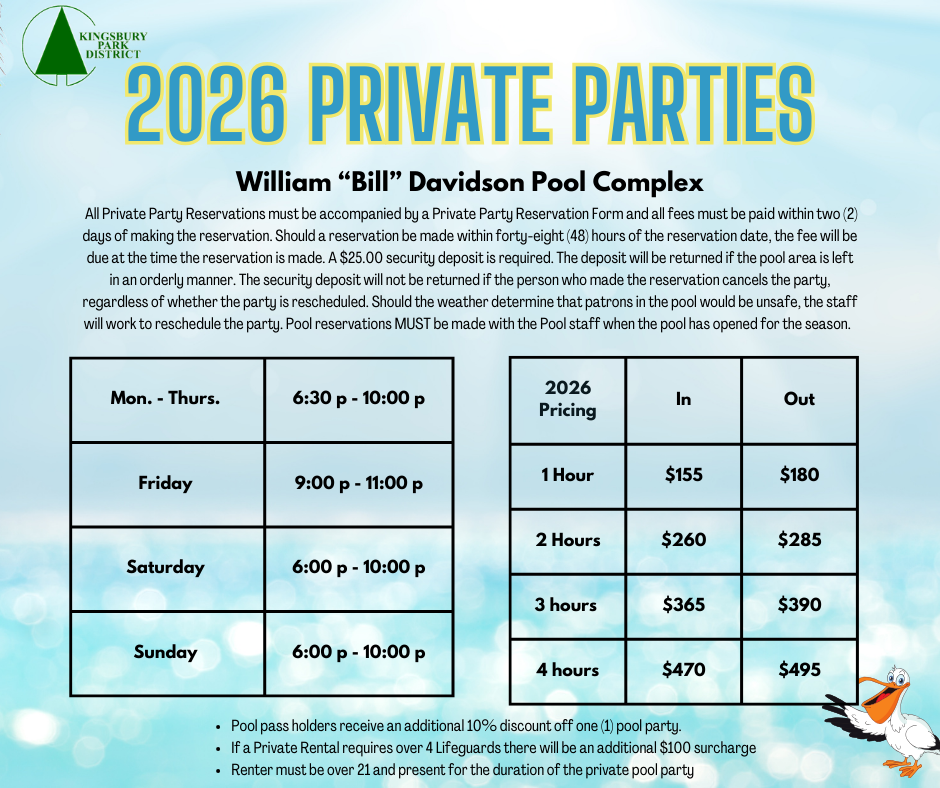 Capacity limits may apply. Please contact the Kingsbury Park District office for details.